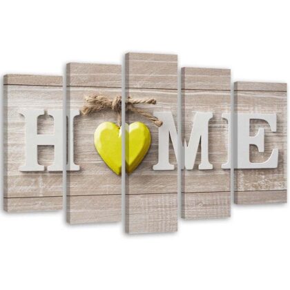 Obraz 5 częściowy na płótnie, Napis Home z żółtym sercem na jasnych deskach