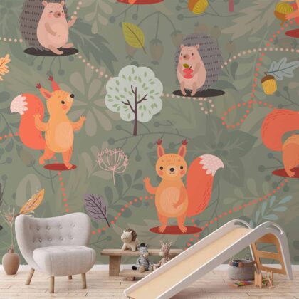 Fototapeta – Przyjaciele z lasu – kolorowy las z grzybkami i zwierzętami dla dzieci